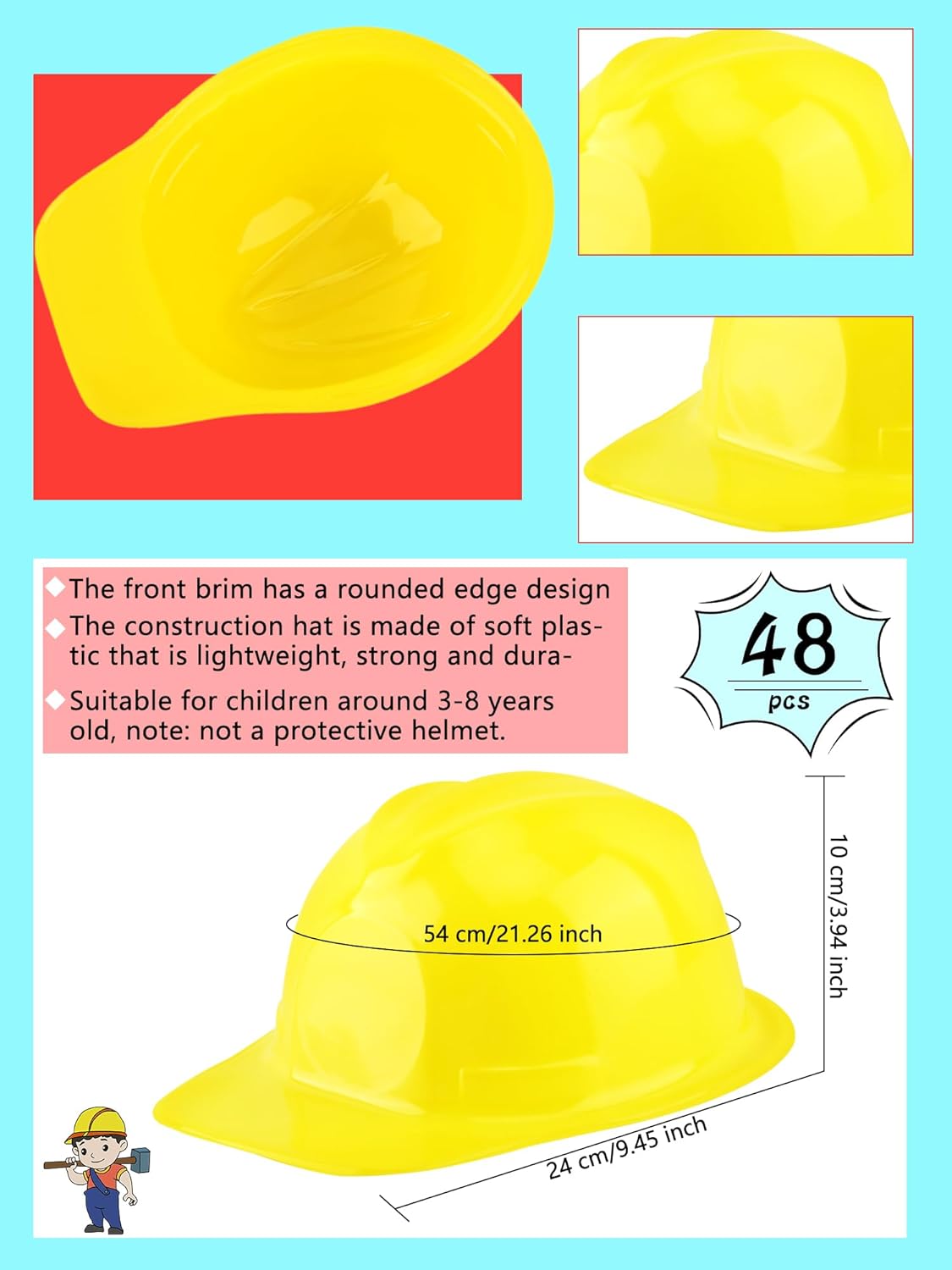48 Pcs Kids Construction Party Hats Plastic Construction Worker Hard Hats Worker Caps Toys for Boys Girls Halloween Cosplay Wide Application: Kids construction worker party hats set is a great gift for kids, it not only encourages children to play actively in parties and activities, but also makes children love labor more and understand construction workers industry better. Can be used for birthdays, Christmas costumes, Halloween parties, school cosplay events, dress up career day and stage performances, etc. Material: Plastic Color: As shown Quantity: 48 pack Package include: 48 x kids construction party hats Note: suitable for child 3 years up