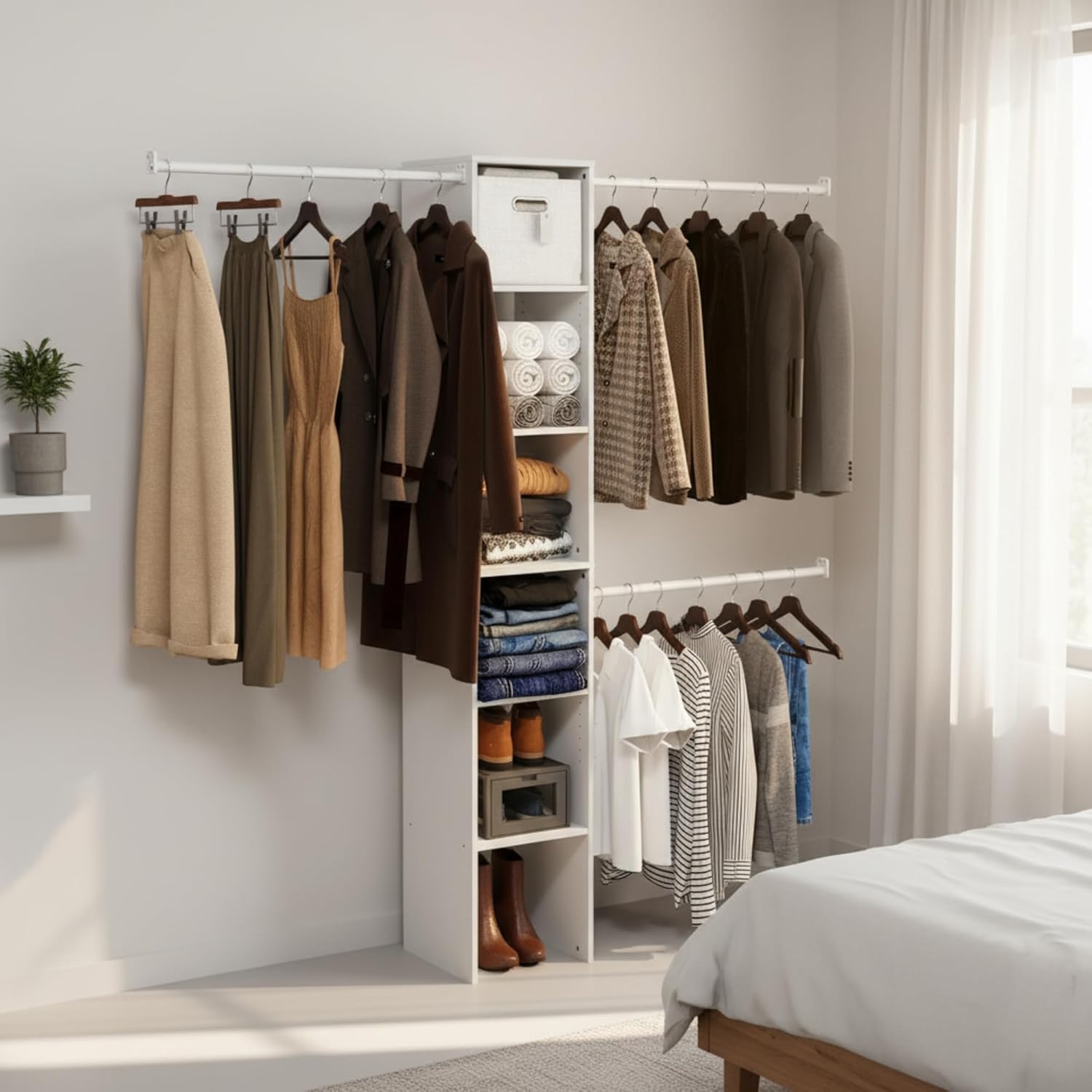 The Fano Clothing & Closet Storage Organizer Shelf Tower is a practical and stylish solution for organizing garments, accessories, and everyday essentials. Designed to fit seamlessly into closets, bedrooms, or dressing areas, it efficiently utilizes vertical space while maintaining a sleek, modern look. This organizer features five sturdy shelves, including two adjustable shelves, along with three expandable hanging bars that extend from 27 to 49 inches. The hanging bars can be installed on either side, allowing you to customize the layout based on your storage needs—ideal for shirts, dresses, jackets, and more. Constructed from CARB-grade composite wood, the organizer is tested for strength and stability while meeting eco-friendly standards. Assembly is quick and straightforward with included instructions. Backed by a 1-year warranty against manufacturer defects, this closet organizer delivers reliable storage that fits your space and your budget.