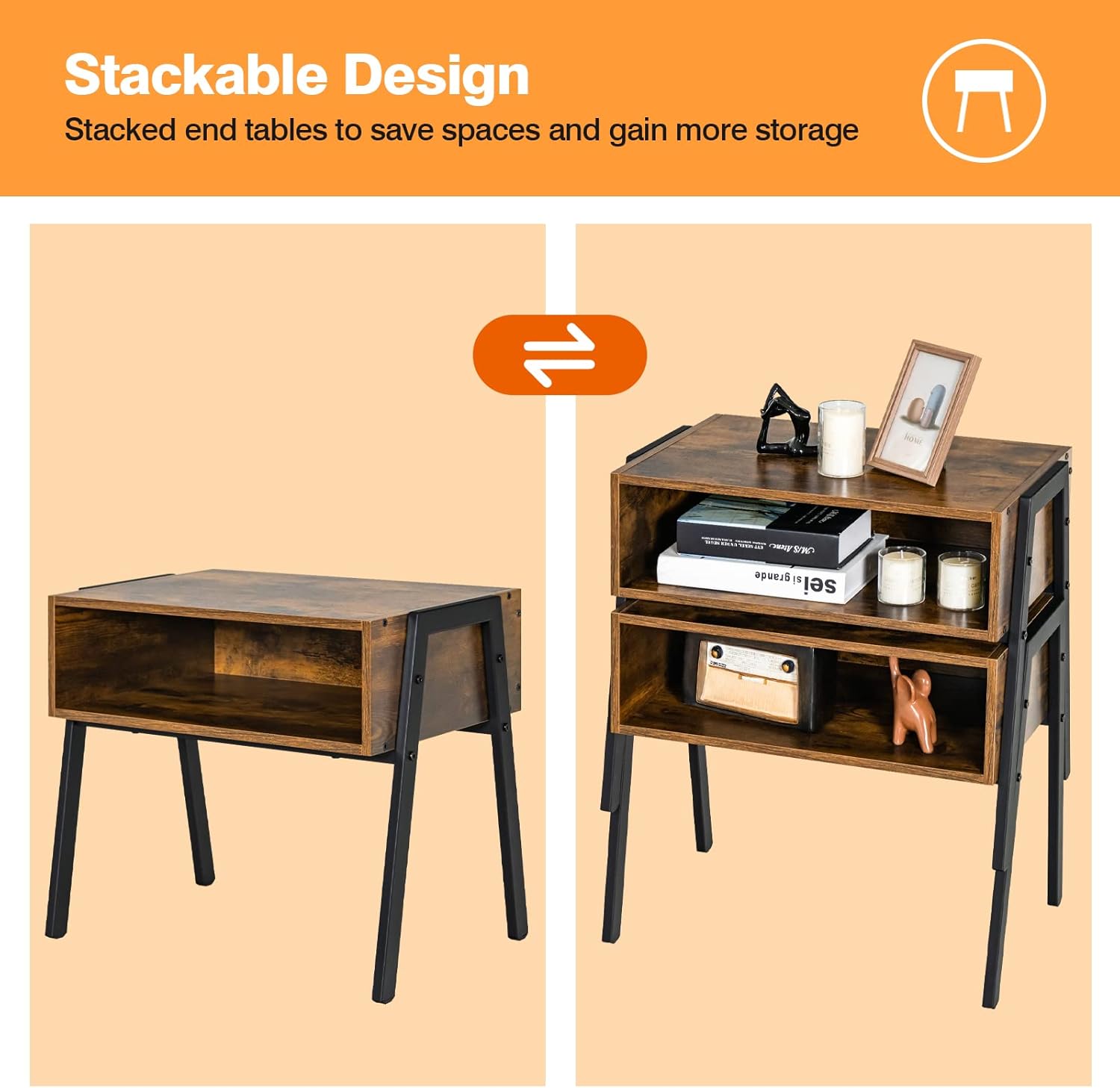 Description:Our Stackable nightstand set of 2 will expand your storage while saving spaces. Each nightstand is made of P2 MDF and steel, so it features strong load capacity. Anti-slip pads further enhance stability. Moreover, with a wide top and an open compartment, each end table can accommodate plenty of items, such as lamps, photo frames, magazines, etc. With trapezoidal frames, it is convenient for you to stack one to another and put them in a small corner. Finally, the whole assembly is very simple which you can finish quickly.Features:Stackable design to save spaces and get more storageWide tabletop and two compartments to store many itemsP2 MDF surface with an industrial style and easy to cleanReinforced steel frame for enhanced load capacityAnti-slip pads for ensured stability and floor protectionServes as a nightstand set, an end table set or a side table setApplicable to bedroom, living room, study and so onEasy installation under the guidance of a detailed manualSpecifications:Color: Rustic BrownMaterial: P2 MDF, SteelSize of Each Nightstand: 21.5” x 14” x 18” (L x W x H)Inner Size of Compartment: 19” x 13” x 5.5” (L x W x H)Size of Stacked Nightstands: 21.5” x 14” x 25” (L x W x H)Load Capacity of Top: 55 lbsLoad Capacity of Compartment: 22 lbsNet Weight of Each End Table: 15.5 lbsPackage Includes:1 x Stackable Nightstands1 x User Guide