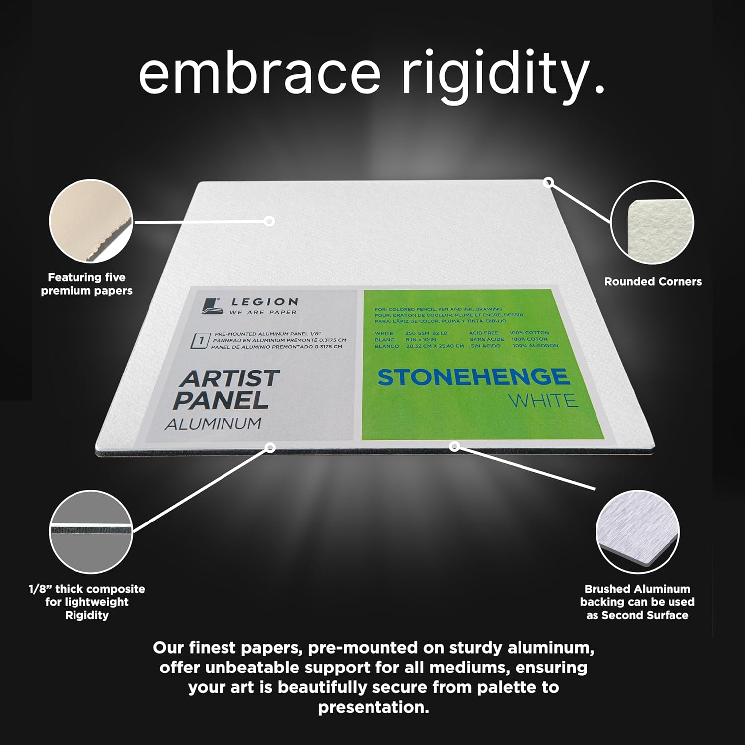 Legion Paper, the premiere supplier of fine art paper in North America, is proud to introduce your art’s new foundation: Legion Artist Panels, featuring five of Legion’s best fine art papers deftly mounted onto chic and handsome brushed aluminum backings. Legion Artist Panels are the result of years of collaboration with artists. You wanted something that is sturdy but could go anywhere. Well, the aluminum is not only virtually indestructible (and stylish), it allows you to create your vision on the go, without fear of bends or buckles, dog-ears or creases. Frame-ready, this beautiful, new generation of art tech comes in a variety of sizes, shapes, and papers so the panels can complement any creative vision you have in mind. Introducing the five premiere artist papers that front Legion Artist Panels: Stonehenge Aqua Coldpress 140lb White - Experience this popular watercolor paper now backed with the stability of an easel; Stonehenge Aqua Coldpress 140lb Black – Same as the white, but opposite. See how your opaque colors and pearlescents gleam from its ebony surface; Stonehenge Oil– Just grab your oil paints and summon every ounce of your plein-air creativity with this no-prep gem; Stonehenge White– Discover our best-selling drawing paper, now with incredible support from below; YUPO Medium– Now for something different. These panels are perfect for non-traditional artists who want non-traditional effects. At Legion, we believe that great artwork demands a great surface (and now a great backing). With Legion Artist Panels, those surfaces get the love and support they need to shine while safely securing all you’ve rendered. It’s the best art papers living their best life.