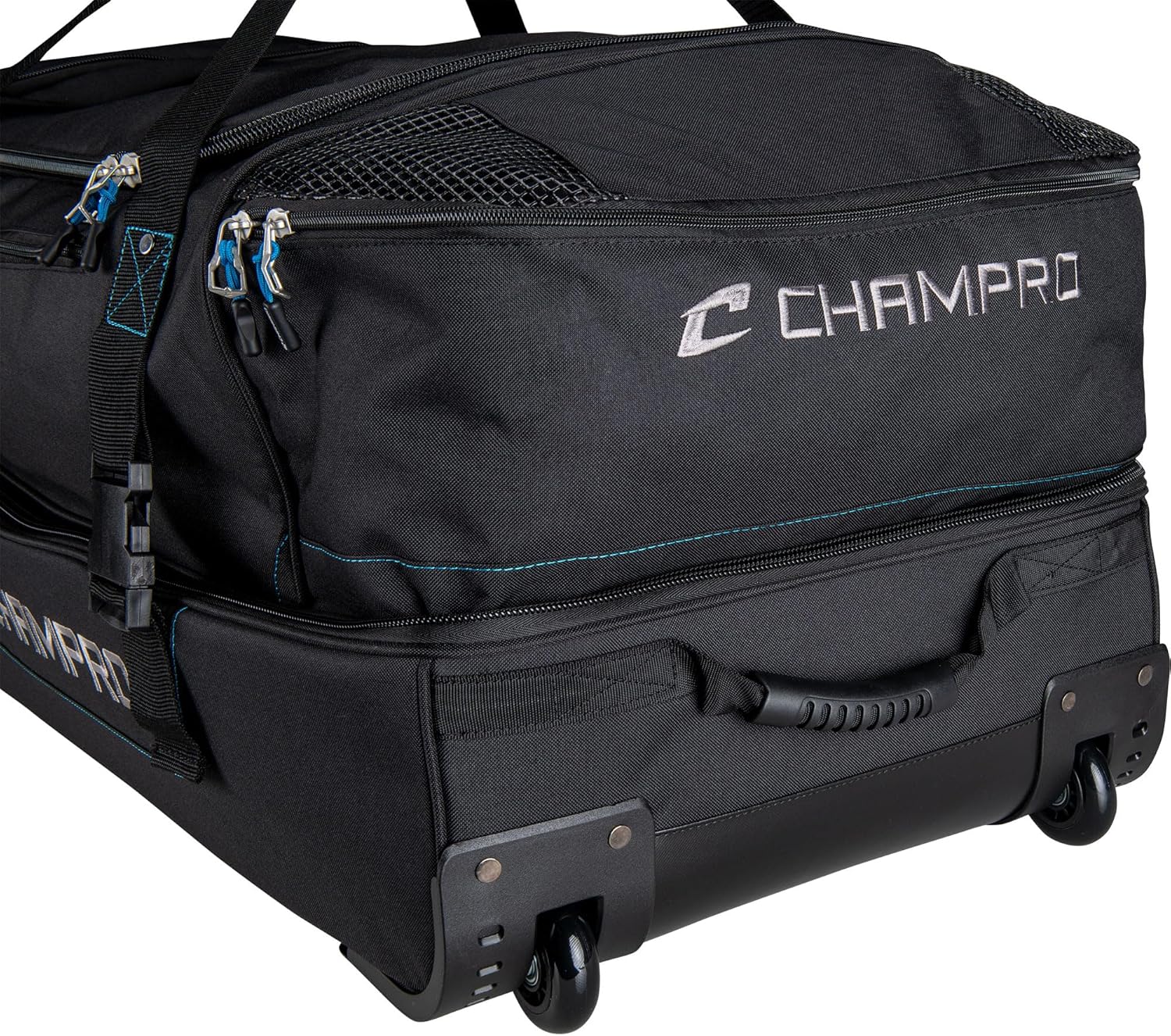 Oversized design features separate upper and lower compartments with zippered access. Dual-side zippered pockets for personal gear and shoe storage. Internal main pocket personal organizer. Exterior front pocket for quick access to game and personal gear. Organize your gear with the internal adjustable detachable divide. Includes wrap-around handles and end handles for easy lifting. All-terrain wheels provide traction on and off the field. Made with water-resistant 600D polyester fabric. Measures 36"x16"x17".
